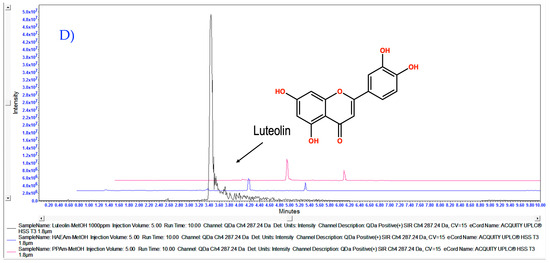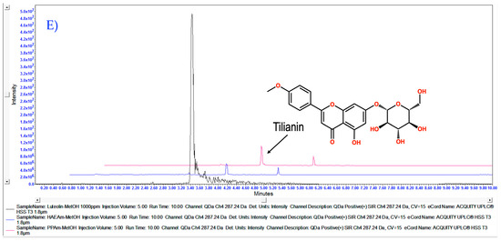 (A) Overlaid chromatograms for PPAm TIC with mass scan 50.0–1250 Da and selected channels for identification of 285.26 Da acacetin, 287.2 Da luteolin, 447.4 tilianin, 457.70 oleanolic acid and ursolic acid with 3D Chromatogram. (B) Stack plot for PPAm (1) TIC and selected channels from mass scan at (2) 285.26 Da m/z [M+1] for acacetin identification, peak retention time 4.66, (3) 287.24 Da m/z [M+1] for luteolin identification, peak retention time 3.49, (4) 447.40 Da m/z [M+1] for tilianin peak retention time 3.43. (5) Oleanolic acid and ursolic acid, mass not detected. (C–E) show the overlaid chromatogram for acacetin, luteolin and tilianin, respectively comparing standard ant 1000 ppp against HAEAm and PPAm at 100 ppm. Acquired in positive mode [ESI+] gradient elution; the x-axis represents time, and the y-axis represents signal intensity for 3D chromatogram z-axis represent mass in Da. Column ACQUITY UPLC® HSS T3 130 Å (1.8 µm, 2.1 × 100 mm). For additional details, complete retention time, and mass data for Figure 2A,B, please refer to Supplementary Material Table S1.