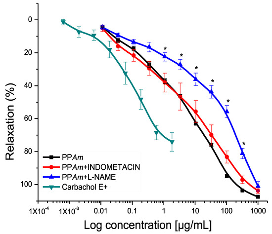 With these results, we decided to establish the mechanism of action of PPAm in the presence of endothelium. Figure 5 shows the partial blocking of the relaxing activity induced by L-NAME, observed by the shift to the right on the concentration–response–relaxant curve of PPAm in the presence of the inhibitor, where the potency decreased significantly with respect to the control curve. Furthermore, the concentration-dependent effect is appreciated. These results indicate that the effect of PPAm was reduced in the absence of NO, suggesting that eNOS participates in the pharmacological effect observed [10,19]. On the other hand, with indomethacin, there was no significant difference compared to the control, indicating that the precipitate did not induce the synthesis of PGl2 via COX.