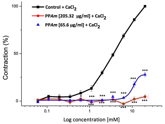 Inhibitory effects of PPAm on the cumulative contraction curves, dependent on extracellular Ca2+ influx in Ca2+-free solution. Data are expressed as means ± SEM of six experiments (* p < 0.05, ***p < 0.001).