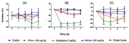 Maximal decrease in (A) heart rate, (B) systolic blood pressure, and (C) diastolic blood pressure (%) elicited by PPAm (100 mg/kg) intragastric administration on SHR acute test, the X-axis represents time in hours, and Y-axis represents variation in percentage. Results are expressed as means ± SEM, n = 6 rats per group, * p < 0.05, ** p < 0.01 and *** p < 0.001 vs. Control.