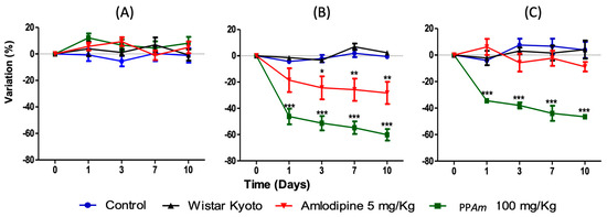Maximal decrease in (A) heart rate, (B) systolic blood pressure and (C) diastolic blood pressure (%) elicited by intragastric administration of PPAm (100 mg/Kg) on SHR subacute test; X axis represents time in days, and Y axis represents variation in percentage. Results are expressed as means ± SEM; n = 6 rats per group; * p < 0.05, ** p < 0.01 and *** p < 0.001 vs. Control.