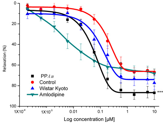 After this test, the subacute antihypertensive test was conducted, where the previous four groups were used. Measurements were recorded before and after i.g. administration dose of PPAm (100 mg/kg/day), or amlodipine (5 mg/kg/day) at 0, 1, 3, 7, and 10 days. Subsequently, the animals of the subacute antihypertensive study were sacrificed, and the aortic rings of each group were used to construct concentration–response curves for relaxation (carbachol), following the methodology detailed above.