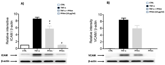 Effect of PPAm on ICAM (A) and VCAM (B) protein levels in HUVEC cells after stimulation with TNF-α for 180 min. The total cellular extracts were subjected to Western blot analysis. Relative intensity values were normalized using β-actin and were expressed relative to the control (CTRL; cell cultures without treatment). Values are presented as means ± SEM of three independent experiments. * p < 0.05 compared to control, # p < 0.05 compared to TNF-α.