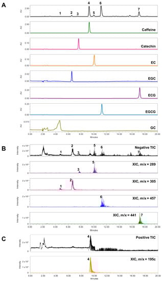 Representative HPLC chromatogram of CE at 270 nm (A), negative ion chromatogram (B), and positive ion chromatogram (C). 1. gallocatechin (GC); 2. epigallocatechin (EGC); 3. catechin; 4. caffeine; 5. epicatechin (EC); 6. epigallocatechin gallate (EGCG); and 7. epicatechin gallate (ECG). HPLC: high-performance liquid chromatography, CE: Camellia sinensis (L.) Kuntze extract.