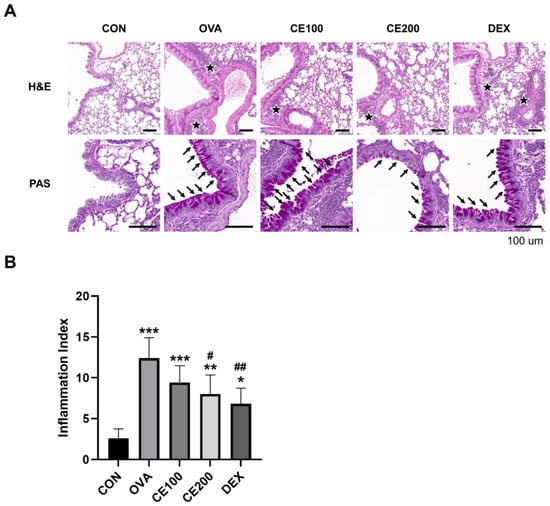 Effects of CE on lung morphology. (A) The lung tissue sections were stained with PAS and H&E. (B) Histopathological analysis on airway inflammation. CON: control group, OVA: OVA-induced asthmatic group, CE100: asthmatic + 100 mg/kg CE, CE200: asthmatic + 200 mg/kg CE, DEX: asthmatic + 5 mg/kg dexamethasone. Black stars indicate inflammatory cell infiltration. Black arrows indicate goblet cell proliferation and mucus hypersecretion. * p < 0.05, ** p < 0.01, and *** p < 0.001 compared to the CON group; # p < 0.05 and ## p < 0.01 compared to the OVA group. PAS: periodic acid–Schiff, H&E: hematoxylin and eosin, CE: Camellia sinensis (L.) Kuntze extract.