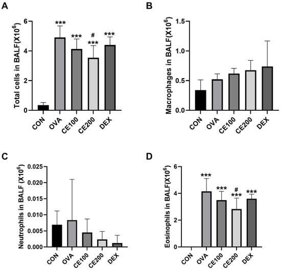 Inflammatory cell numbers in BALF in response to CE. Total cells (A), macrophages (B), neutrophils (C), and eosinophils (D) are shown. CON: control group, OVA: OVA-induced asthmatic group, CE100: asthmatic + 100 mg/kg CE, CE200: asthmatic + 200 mg/kg CE, DEX: asthmatic + 5 mg/kg dexamethasone. *** p < 0.001 compared to the CON group and # p < 0.05 compared to the OVA group. BALF: bronchoalveolar lavage fluid, CE: Camellia sinensis (L.) Kuntze extract.