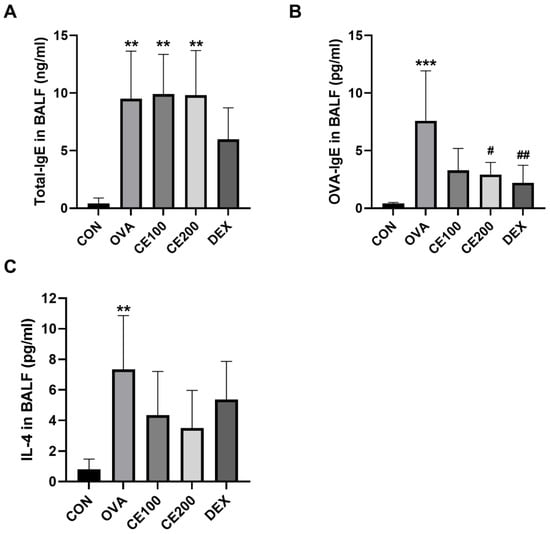 BALF was subjected to ELISA to determine whether exposure to OVA increased the concentrations of IgE and IL-4 and whether CE had an inhibitory effect. A significant increase in IgE production level was detected in the OVA-induced asthmatic group compared to the control group (Figure 4). Moreover, the DEX group showed a lower level of total IgE and OVA-IgE levels compared to the OVA-induced asthmatic group, and a significant difference in OVA-IgE levels was observed. However, only the CE200-treated group demonstrated an effect of CE treatment on the levels of OVA-IgE, with a significant reduction compared to the levels observed in the OVA-induced asthmatic group (Figure 4B). Given the IL-4 levels detected in the BALF, we confirmed that the OVA-induced asthmatic group had substantially higher levels than the control group. Moreover, the IL-4 levels in the BALF were also lower in the CE-treated and DEX-treated groups compared to those in the OVA-induced asthmatic group, although not significantly.