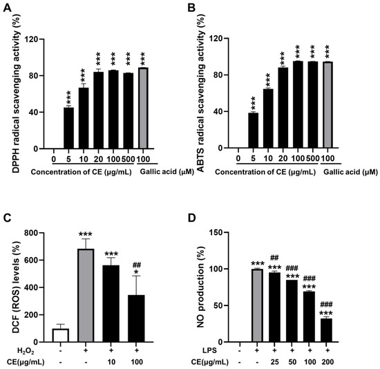 Effects of CE on anti-inflammatory and antioxidant activities. Anti-inflammatory activity detection data are shown for 2,2-diphenyl-1-picryl-hydrazyl-hydrate (DPPH) (A) and 2,2′-azino-bis-3-ethylbenzthiazoline-6-sulphonic acid (ABTS) (B), 2,7-dichlorodihydrofluorescein diacetate (DCFDA) (C), and scavenging activities in antioxidant activity detection and nitric oxide (NO) assay (D). * p < 0.05 and *** p < 0.001 compared to the LPS-non-treated group; ## p < 0.01, and ### p < 0.001 compared to the LPS-treated group.