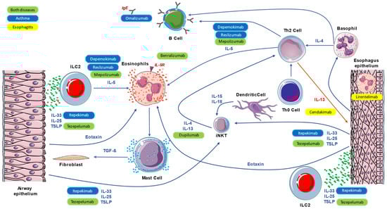 Type 2 (T2) inflammation was identified as a pathogenic phenomenon underlying various diseases, such as asthma, nasal polyposis, and atopic dermatitis. The eosinophilic inflammatory infiltrate, which is typical of T2 inflammation, has been demonstrated to be present in other diseases, including eosinophilic esophagitis (EoE). Asthma is a well-known disease, characterized by chronic airway inflammation and bronchial hyperresponsiveness, resulting in airflow limitation and respiratory symptoms. In the pathogenesis of asthma, interactions between genetic predisposition, environmental factors, and immune dysregulation play a role in the genesis of disease. The hallmark of asthma is chronic airway inflammation, primarily driven by type 2 (T2) immune responses. This immune activation results in the recruitment of eosinophils, mast cells, IgE, and other inflammatory cells to the airways, leading to structural changes and remodeling, increased mucus production, and bronchospasm. Several cytokines, including interleukin (IL)-4, IL-5, IL-13, IL-25, and IL-33, thymic stromal lymphopoietin (TSLP), and cells such as innate lymphoid cells type 2 (ILC2s), play crucial roles in orchestrating the inflammatory response in asthma. Among the cells responsible for inflammation that are regulated by the inflammatory pathway related to the cytokines earlier mentioned, are eosinophils. These cells are increased in both the blood and airway tissues of asthma patients and have become direct or indirect targets of many drugs developed to be controllers of asthma. With the development of knowledge regarding the pathophysiological mechanisms of T2-defined inflammation, it has been possible to associate some diseases with asthma, not only epidemiologically, but also using the inflammation pathway. These certainly include chronic rhinosinusitis with nasal polyposis (CRSwNP) and atopic dermatitis, which have a rather high incidence of coexistence with asthma. In contrast, diseases that are less frequently associated with asthma include eosinophilic esophagitis (EoE), despite it being proven that the presence of type 2 inflammatory diseases significantly increases the risk of EoE [1]. It is estimated that patients with EoE are commonly affected by asthma in about 45.4% of cases [2]. On the other hand, a prevalence of 16.5% of EoE has been reported in allergic patients [3].