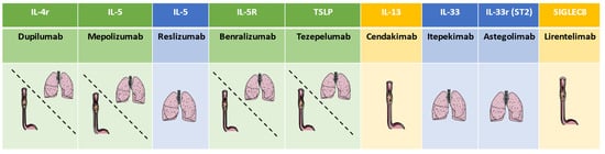 - Cheng, S.-L. Molecular Targets for Biological Therapies of Severe Asthma: Focus on Benralizumab and Tezepelumab. Life 2021, 11, 744. [Google Scholar] [CrossRef]