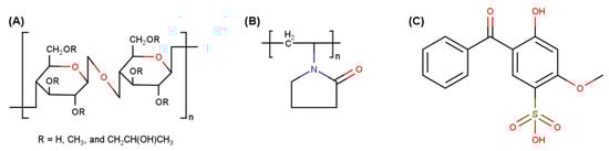 Chemical structures of (A) hydroxypropyl methylcellulose (HPMC), (B) polyvinylpyrrolidone (PVP), and (C) benzophenone-4.
