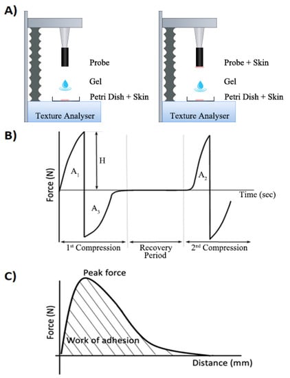 (A) Schematic diagram of the TXA setup for bioadhesion testing using a standard setup (left) with single skin substrate, or alternative setup (right) with gel between two skin substrates. (B) Force–time graphical output from texture profile analysis. H = Hardness. A1 = Compressibility. A3 = Adhesiveness. A2/A1 = Cohesiveness. (C) Schematic graph showing the applied peak force and work of adhesion provided by the texture analyzer software (Brookfield Rheocalc version 3.2.47).