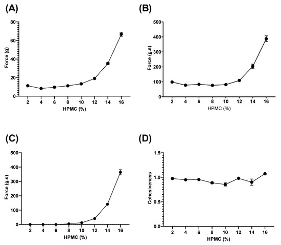 Mechanical properties of homopolymeric HPMC (2–16%) hydrogels obtained with a texture analyzer. (A) Hardness; (B) Compressibility; (C) Adhesiveness; and (D) Cohesiveness. Data are mean ± SD (n = 3).