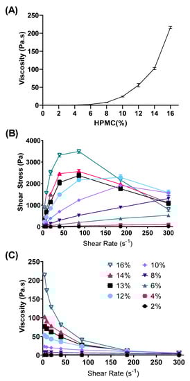 Rheological properties of gels containing HPMC 2–16%: (A) Viscosity curve at shear rate = 4 s−1, and rheograms of (B) shear stress vs. shear rate and (C) viscosity vs. shear rate. Data are mean ± SD (n = 3).