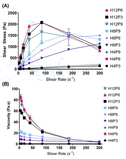 Stronger shear-thinning properties were observed with increasing polymer concentrations in the hydrogels (Figure 6A). Increasing the concentration of PVP in the HPMC–PVP binary hydrogels lead to an increase in viscosity, together with more profound shear-thinning properties. The viscosity for all gels dropped to similar levels when the shear rate was increased to 200 s−1 (Figure 6B). Interestingly, despite the increase of PVP to 9% for H12P9, there was a slight decrease in the viscosity along with a significant reduction in its’ peak shear stress (at shear rate = 86 s−1), which was lower than both H12P3’s and H12P6’s (Figure 6A). This is aligned with a reduction in the cohesiveness for the same formulation which was seen in the texture analyzer tests, and it further reinforces the finding that the structure of the polymer network in the binary hydrogels was compromised at high PVP concentrations.