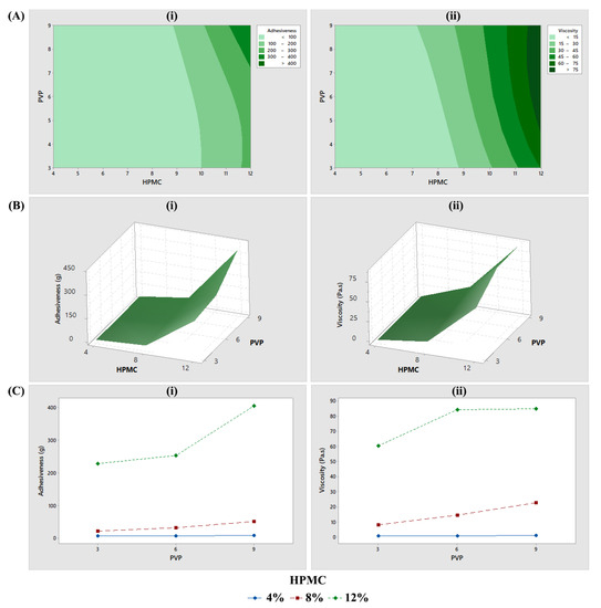 The 32 factorial design analysis using Minitab. (A) Two-dimensional contour plot, (B) three-dimensional surface plot, (C) interaction plot, for adhesiveness (i) and viscosity (ii).
