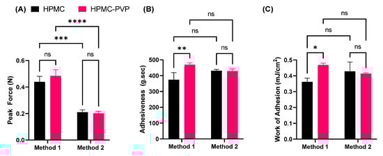 Bioadhesion results for the H12P6 binary gel for either a single (method one) or double (method two) skin substrate setups. (A) peak force; (B) adhesiveness; and (C) work of adhesion. Data are mean ± SD (n = 3). *: p < 0.05; **: p < 0.01; ***: p < 0.001; ****: p < 0.0001; ns = non-significant difference.