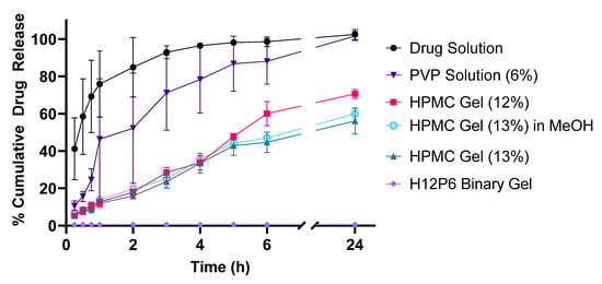 Four formulations (PVP 6%, HPMC 12%, HPMC 13%, H12P6) suspended in PBS and one formulation (HPMC 13% in MeOH) in methanol were tested for drug release by placing the dialysis bags loaded with samples in 50 mL of either PBS or methanol as external media in separate Falcon tubes and suspended in a water bath at 33 °C with oscillation set at 60 rpm. Aliquots (1 mL) from the external media were withdrawn at various time points (0.25, 0.5, 0.75, 1, 2, 3, 4, 5, 6, and 24 h) and immediately replaced with an equivalent volume of PBS or methanol. The drug content in the external media was analyzed directly through a validated high-performance liquid chromatography (HPLC) assay [38].