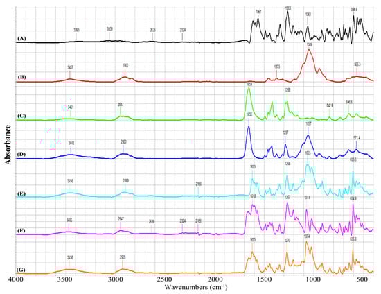 FTIR Spectra for (A) benzophenone-4, (B) HPMC, (C) PVP, (D) HPMC–PVP, (E) HPMC + BNZ4, (F) PVP + BNZ4, and (G) HPMC–PVP + BNZ4 freeze-dried gels.