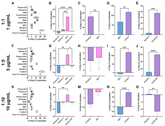 Inhibition of TLR 3 by scavengers. NABNs were tested in various Poly I:C: scavenger ratios, 1:1 (A–E), 1:5 (F–J), 1:10 (K,L) to determine relative inhibition ability of TLR3. Polymeric materials (B,G,L), novel structures (C,H,M), anionic materials (D,I,N), and PEI-based (E,J,O) are compared. * p < 0.05, ** p < 0.01, *** p < 0.001, **** p < 0.0001.