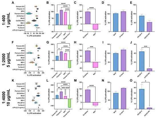 Inhibition of TLR 4 by scavengers. NABNs were tested in various LPS: scavenger ratios, 1:400 (A–E), 1:2000 (F–J), 1:4000 (K,L) to determine relative inhibition ability of TLR4. Polymeric materials (B,G,L), novel structures (C,H,M), anionic materials (D,I,N), and PEI-based (E,J,O) are compared. * p < 0.05, ** p < 0.01, *** p < 0.001, **** p < 0.0001.