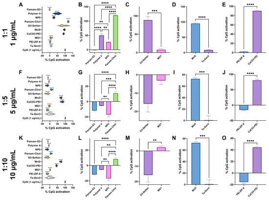 Inhibition of TLR 9 by scavengers. NABNs were tested in various CpG: scavenger ratios, 1:1 (A–E), 1:5 (F–J), 1:10 (K,L) to determine relative inhibition ability of TLR9. Polymeric materials (B,G,L), novel structures (C,H,M), anionic materials (D,I,N), and PEI-based (E,J,O) are compared. ** p < 0.01, *** p < 0.001, **** p < 0.0001.