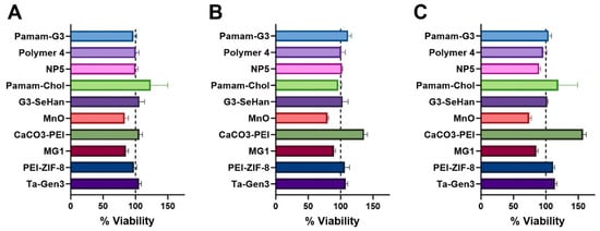 The majority of the NABNs showed no effects on the cytotoxicity of cells at any of the concentrations tested, despite their high charges and efficient scavenging abilities. Interestingly, CaCO3-PEI seems to increase cell proliferation in a dose-dependent manner, while MnO appears to have mild toxicity at increased concentrations (Figure 5). This may be because MnO, like many metal oxides, has features of an oxidant, which has unresolved risks when used in biomedical applications []. For example, MnO reacts with HCl and forms MnCl2. Mn(II) ions may intercalate with DNA, which may be a reason for toxicity [].