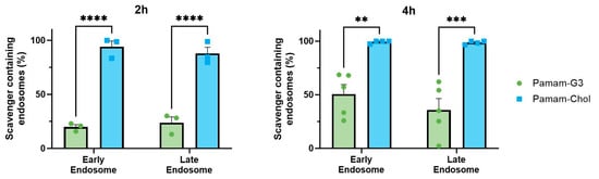 Endosomal uptake and retention of soluble NABN Pamam-G3 vs PAMAM-Cholesterol(5) NP at 2 and 4 h. ** p < 0.01, *** p < 0.001, **** p < 0.0001.