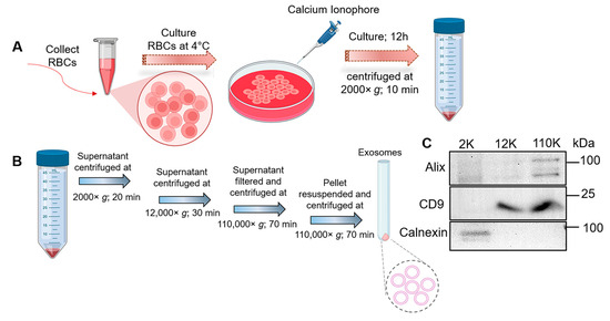 (A) Schematic showing the collection, culturing, and induction of RBCs with a chemical agent to produce Exos. (B) Schematic outlining the steps for isolation and purification of Exos by sequential centrifugation. (C) Western blot image showing protein markers positive (Alix and CD9) and negative (Calnexin) for Exos in samples collected after centrifugation at 2000× g, 12,000× g, and 110,000× g speeds. This schematic illustration was created using BioRender.com (accessed on 5 November 2023) with an authorized license.