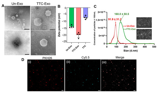 The morphology of the Exo samples, comprising both TTC-Exo and Un-Exo varieties, was initially examined using TEM, and the results are presented in Figure 3A. The TEM images indicated that both sets of Exos had cup-like, membranous structures. The TTC-Exo sample exhibited a general increase in diameter when compared to the Un-Exo sample. The surface potential was also measured, revealing an increase in negative potential from −13.5 ± 0.9 mV to −19.5 ± 1.8 mV (Figure 3B). Additionally, the particle concentration and size distributions were analyzed, confirming an increase in size from 91.9 ± 31.2 nm in the Un-Exo sample to 168.8 ± 50.5 nm in the TTC-Exo group, likely as a result of functionalization with TTC-PEG5000-N3 molecules (Figure 3C). Finally, the success of the click reaction in the conjugating groups on the Exo surface was confirmed through the visualization of PKH26 stained Exos functionalized with DBCO (Figure 3D(i)) and Cy5.5-azide conjugated protein fragment (Figure 3D(ii)) via CLSM, as shown in the merged image (Figure 3D(iii)).