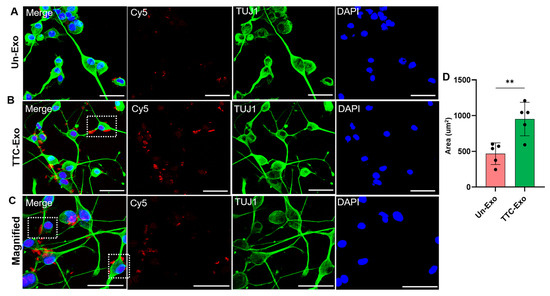 The aim of this study was to examine the distribution of Un-Exo and TTC-Exo in Neuro-2a cells using CLSM. Each well received a median dosage of 1 × 1011 Exos/mL and was incubated overnight. IF staining of TUJ1, which is implicated in neurogenesis, axon growth and maintenance, was performed to detect its expression in the PNS and central nervous system neurons during the early stages of neural differentiation [45], while DAPI was used to co-stain neuronal cell nuclei. The TTC-Exos were found to be distributed along the soma and axons of the neuronal cells (as depicted in Figure 4). Expectedly, the intensity and distribution of Cy5 (red) was significantly higher in the TTC-Exo samples (Figure 4B) than the Un-Exo (Figure 4A). A closer look at the distribution of TTC-Exos revealed that they were primarily located along the somal circumference of cells (Figure 4C). A semi-quantitative analysis was conducted to distinguish the distribution between both groups (Figure 4D). The TTC-Exo signal covered approximately twice as much area as the Un-Exo signal, indicating a notable improvement in cellular specificity and binding facilitated by the TTC protein. These results provide promising evidence that modifying Exos with the TTC fragment can significantly enhance the ability of the Exo drug delivery system to specifically target neurons in the PNS.