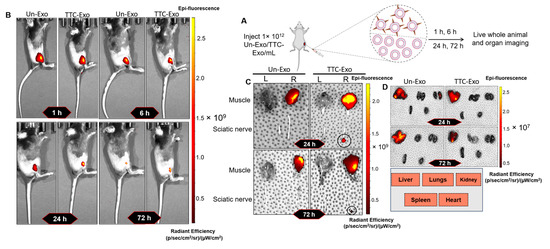 Bio-distribution and tissue imaging study for Un-Exos and TTC-Exos in vivo. (A) Schematic representation of intramuscular administration of labeled Exos, followed by IVIS imaging at different time points. (B) Whole-animal fluorescence images of Un-Exo and TTC-Exo groups at 1, 6, 24, and 72 h timepoints. (C) Epi-fluorescence images of the gastrocnemius muscle and sciatic nerve from the left and right regions of animals from Un-Exo and TTC-Exo groups that were dissected 24 and 72 h after administration (L = Left side/contralateral side and R = Right side/ipsilateral side). (D) Epi-fluorescence images of organs isolated from Un-Exo and TTC-Exo groups 24 and 72 h after administration.