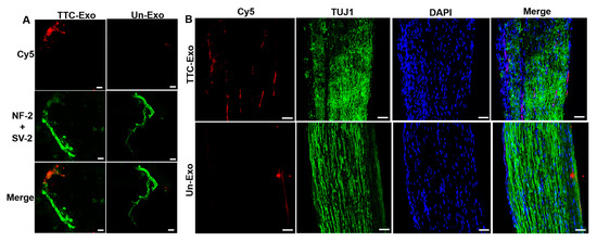 Immunostaining and fluorescence imaging study for Un-Exos and TTC-Exos in PNS tissues. (A) Immunostaining and CLSM images of the neuromuscular junction (NMJ) in the right gastrocnemius muscle fibers dissected from TTC-Exo and Un-Exo animal groups showing Cy5 (red) and neurofilament and synaptic vesicle-2 (green). (B) Immunostaining and CLSM images of sciatic nerves isolated from TTC-Exo and Un-Exo animal groups indicated by Cy5 (red), TUJ1 (green), and DAPI (blue). Scale bar = 50 µm.
