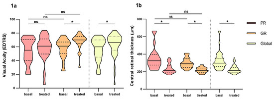Prospective observational study of 44 naïve patients. The demographic parameters of the study population are summarized in Table 1. Our sample study is composed of elderly people where 75% of the patients were over 75 years old at diagnostic with a median age of 80 years. We found 24 good responders vs. 20 poor responders in our group study. Visual acuity and central retinal thickness greatly improved over time between basal and treated patients, although we did not find differences between good responders a poor responders (Figure 1a,b). During study treatment and follow up, no ocular nor systemic adverse effects were reported from any of the patients.