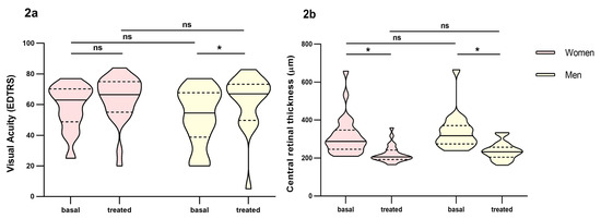 Differences in visual acuity and central retinal thickness between men and women before and at fourth month of intravitreal ranibizumab treatment. (a): Visual Acuity (VA). (b): central retinal thickness. Wilcoxon signed-rank test was used to detect differences between parameter levels over time Mann–Whitney test was used to detect differences between groups. ns: p-value > 0.05; * <0.05.