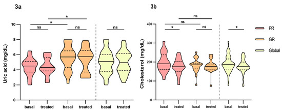 Differences in biochemical parameters uric acid and cholesterol between poor responders and good responders before and at fourth month of intravitreal ranibizumab treatment. (a): Uric Acid. (b): Cholesterol. PR: poor responder; GR: good responder. Wilcoxon signed-rank test was used to detect differences between parameter levels over time Mann–Whitney test was used to detect differences between groups. ns: p-value > 0.05; * <0.05.