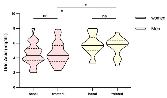 Differences in uric acid between men and women before and at fourth month of intravitreal ranibizumab treatment. Wilcoxon signed-rank test was used to detect differences between parameter levels over time Mann–Whitney test was used to detect differences between groups. ns: p-value > 0.05; * <0.05.