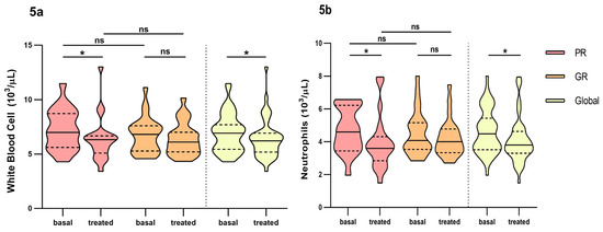 We also found differences over time in global count for white blood cell count (WBC) (6.92 × 103/, IQR: 5.44–7.70 vs. 6.22 × 103, IQR: 5.20–6.93, p = 0.028) and poor responders (6.99 × 103, IQR: 5.62–8.72 vs. 6.32 × 103, IQR: 5.09–6.68, p = 0.030) (Figure 5a). The same for neutrophils (4.48 × 103, IQR: 3.49–5.44 vs. 3.73 × 103, IQR: 3.30–4.63, p = 0.012 in global count and 4.60 × 103, IQR: 3.44–6.22 vs. 3.60 × 103, IQR: 2.85–4.31, p = 0.044 in poor responders) (Figure 5b). We did not find any differences between groups in the short-term analysis of these parameter nor in the rest of the inflammatory parameters studied (Table S3, Supplementary Material). Of the cytokines analysed, IL6 and TNF alpha decreased over time and were over the therapeutic range while IL8 increased over time. None of them reached significance. IL1b, IL5 and IL10 remained unchanged over time (Supplementary Material).