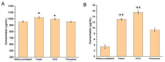 Figure 1. Solubility of nirmatrelvir (NRV) (A) and ritonavir (RTV) (B) in water with different surfactants (data are presented as the mean ± SD, n = 3). * p < 0.05 vs. the no surfactant group, and ** p < 0.001 vs. the no surfactant group.