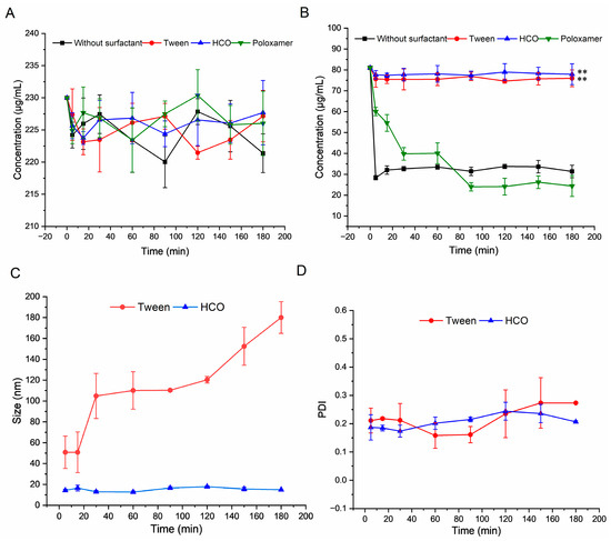 As presented in Figure 2B, surfactants showed significantly different recrystallization inhibition abilities compared to those of the group without surfactants. The concentration of RTV was effectively sustained during the experimental period following the addition of HCO and Tween (p < 0.001). However, recrystallization inhibition was more notable in the HCO group, which is consistent with the results of the solubility enhancement experiments. The addition of the surfactants HCO and Tween facilitated micellization of the system, resulting in enhanced recrystallization inhibition in the supersaturated solution of RTV [42]. The impact of surfactants on drug crystallization in saturated solutions is multifaceted, including the crystalline nucleation induction time and desaturation rates [43].