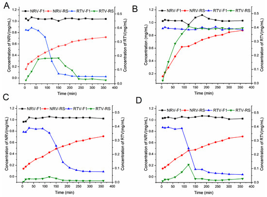 Figure 3. Changes in the concentrations of nirmatrelvir/ritonavir (NRV/RTV) for F1 and RS in media with various pH values: (A) water; (B) pH 1.2; (C) pH 4.5; and (D) pH 6.8.