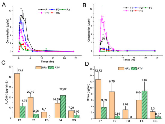 As shown in Figure 4C,D, and Table 4, F1 exhibited considerably higher plasma concentrations of NRV/RTV at an equal dose. The AUC(0–t) of NRV and RTV increased by 6.1- and 3.8-fold, respectively, while Cmax increased 5.5-fold for both, compared to those for RS. Additionally, the Tmax of NRV/RTV in F1 was lower than that of RS, whereas there was no significant difference in t1/2 between the two formulations (Table 4). These findings indicated that F1 improved the absorption rate of the drug but did not substantially affect its metabolism. Furthermore, the liquid formulation F1 led to greater plasma concentrations of NRV/RTV in the short term than RS. This can be attributed to the rapid dispersion and absorption of the liquid formulation. Besides, this observation was consistent with the results of the in vitro experiments.