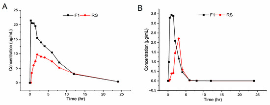 Based on the pharmacokinetic parameters of RTV (Figure 5B and Table 5), F1 had significantly higher Cmax and AUC(0–t) values (3.45 µg/mL and 8.44 µg·h/mL) compared to those of RS (2.21 µg/mL and 4.68 µg·h/mL). In addition, the t1/2 parameter of RTV for F1 was 3.77 h, and for RS was 2.05 h, suggesting that the metabolism of RTV may be faster in liquid form. However, this may require multiple, repeated experiments to verify.
