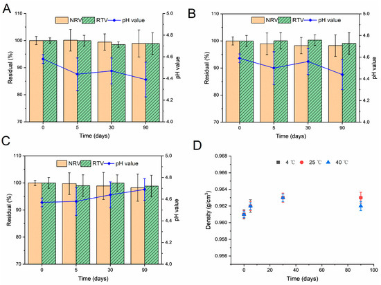 Figure 6. Stability of the liquid formulation after storage at 4 °C (A), 25 °C (B), and 40 °C (C), determined by the residual concentrations (%) of nirmatrelvir (NRV) and ritonavir (RTV), and density (D).