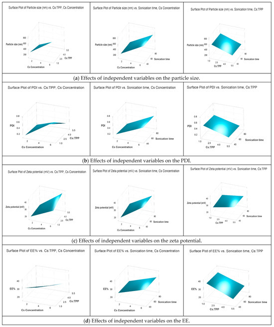 Response surface representing the effect of independent variables, including Cs concentration (mg/mL), Cs:TPP mass ratio, and sonication time (s), on the dependent variables: (a) particle size (nm), (b) PDI, (c) zeta potential (mV), and (d) entrapment efficiency (EE%).