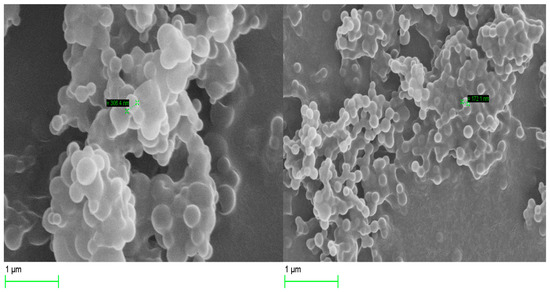 Figure 4 shows SEM images of the optimized Cs NPs loaded with Fasudil. The particles exhibit typical spherical shapes with evidence of particle aggregation. It is important to point out that the observed particle aggregation could be a consequence of the drying process during SEM sample preparation [56,57].
