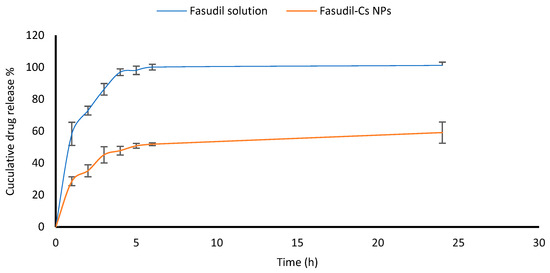 The ability of Cs NPs to release the drug in vitro was investigated in STF under physiological conditions representative of the ocular surface (pH 7.4, 35 °C) for 24 h. The performance of the optimized chitosan nanoparticles was compared to that of the Fasudil solution. Figure 5 shows that approximately 60% of the drug was recovered in the receptor chamber from the solution within the first hour, indicating that the drug had the ability to permeate almost unrestrictedly through the dialysis membrane. In contrast, Cs NPs displayed an initial burst release of Fasudil followed by a sustained release over 24 h. An initial burst release of 35.51% occurred within two hours, followed by an extended release of 47.8% and 55.6% at four and six hours, respectively. The initial burst release may be associated with the desorption of the Fasudil molecules that have been adsorbed at the surface of the Cs nanoparticles or those poorly trapped within the polymeric matrix. From a clinical point of view, an initial rapid release may be advantageous to achieve the therapeutic concentration of the drug in the shortest amount of time, followed by a sustained release. The drug’s presence in the particle’s core may be responsible for the sustained release. M. Bin-Jumah et al. reported similar release profiles for clarithromycin, an anti-bacterial agent [48].