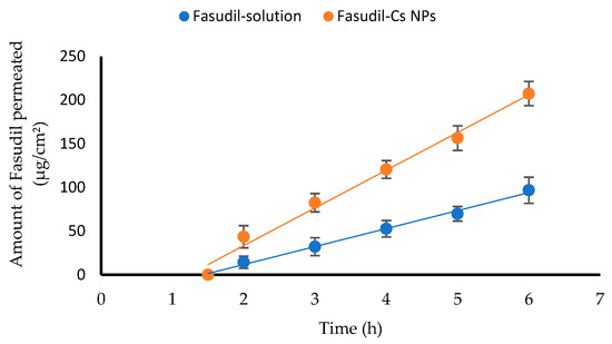 Figure 6 illustrates the trans-corneal permeation profiles of Fasudil through excised bovine corneas. Permeation parameters such as the apparent permeability coefficient (Papp), flux, and lag time (tL) were calculated. Notably, Cs NPs demonstrated a substantial enhancement in Fasudil permeation through the cornea compared to the Fasudil aqueous solution. The flux and Papp values for Cs NPs were 2.1-fold higher than those for the Fasudil solution (Table 9). The cornea’s ability to effectively control Fasudil permeation is evidenced by the linearity of the Fasudil permeation profile. The significant improvement in permeation (p < 0.05) can be attributed to the ionic interactions between the negatively charged corneal surface and the positively charged amino groups on Cs NPs. These findings align with a previous report [58]. Additionally, increased permeation might be caused by the ability of Cs nanoparticles to transiently affect the barrier properties between corneal epithelial cells, which could potentially increase drug flux through the cornea [59].