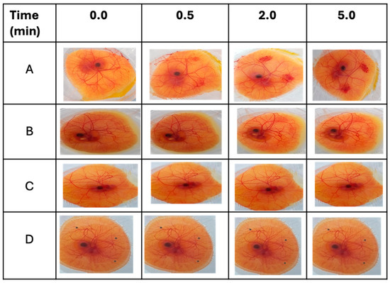 Images displaying the irritant effects of substances applied to the CAMs over a 5 min period: (A) NaOH 0.5 M (strong irritant), (B) propylene glycol (PG) (moderate irritant), (C) normal saline (negative control), and (D) Cs NPs formulation.