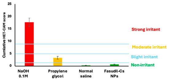 The HET-CAM assay is beneficial for assessing the irritation effect of test substances on ophthalmic tissues such as the conjunctiva [60]. This is because the CAM is a functional membrane that encompasses vasculature and inflammatory responses that can be analyzed for ocular injury-related outcomes. The HET-CAM assay measures the capacity of a test substance to harm blood vessels and provoke adverse effects like hyperemia, hemorrhage, and clotting/coagulation [61]. As seen in Figure 7A, a strong irritant reaction, including clotting and hemorrhage, occurred when the CAM was subjected to a 0.5 M NaOH solution, a potent irritant. Testing with a moderate irritant (propylene glycol) produced a weaker response (compared with NaOH), as depicted in Figure 7B. This finding aligns with the previous report by Smail et al., which stated that propylene glycol can cause a minor irritant effect when used on its own [34]. On the other hand, neither the Cs NPs as depicted in Figure 7D nor the saline solution (negative control) produced any signs of ocular irritation (Figure 7C). The results suggested that the formulated Cs NPs are non-irritant when applied to the surface of the CAM. Figure 8 shows the cumulative scores of the controls and Cs NPs.